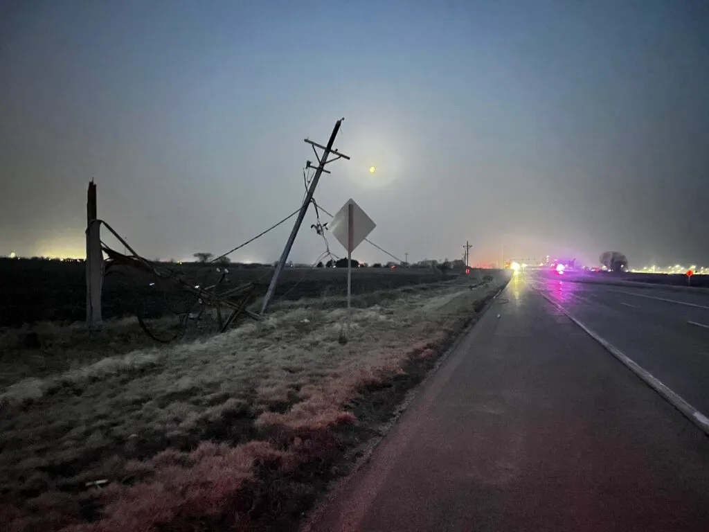 “There’s a pole broken on Creston Road. Those straight line winds that came through last night did a number on our system. So we have a lot of things just kind of hanging on by a thread right now.”